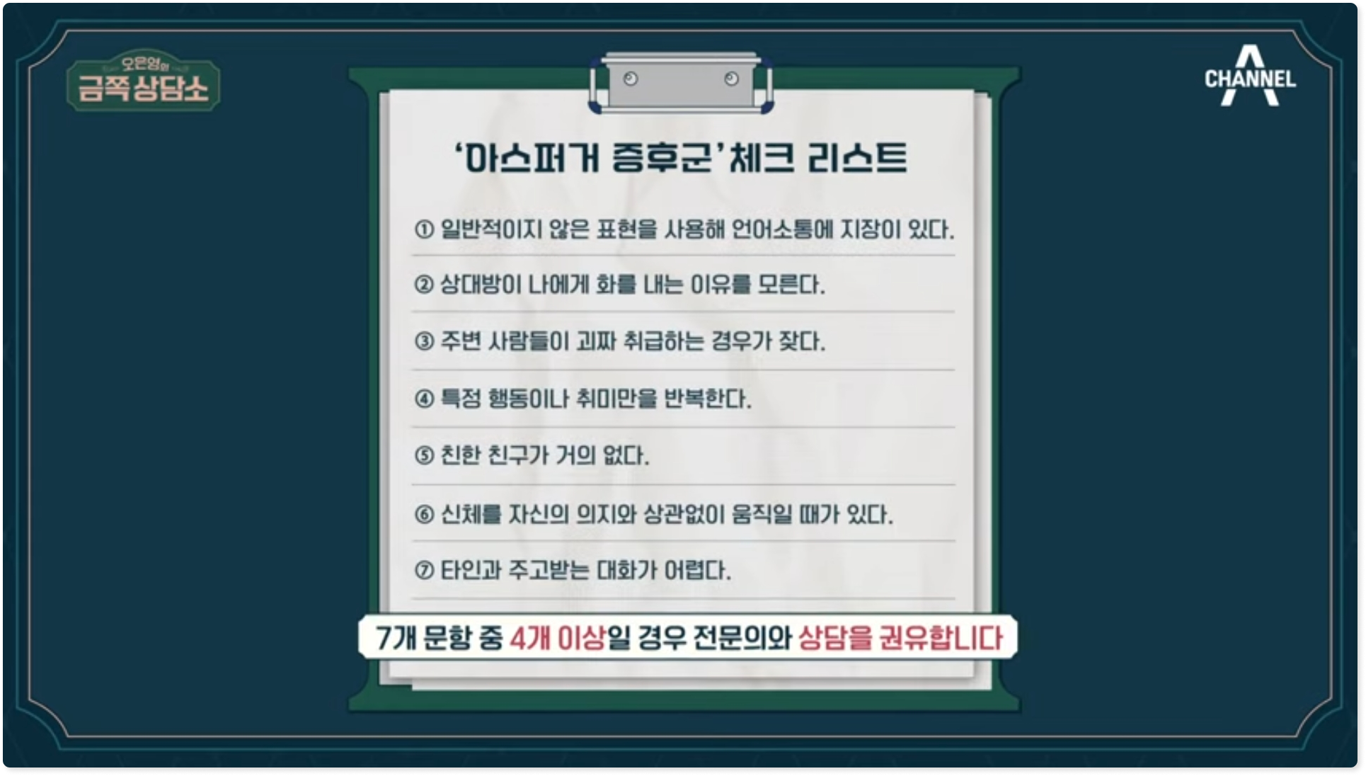 금쪽상담소 리아킴 편에서는 아스퍼거 증후군에 대한 자세한 이야기를 하면서 위와 같이 체크리스트를 이야기 했다. 위의 7개 문항 중 4개 이상일 경우 전문의와 상담을 권유한다. 체크리스트는 자가진단일 뿐이니 맹신할 필요는 없다. 의심이 되는 경우에는 전문의를 찾아가 진단받길 바란다.
