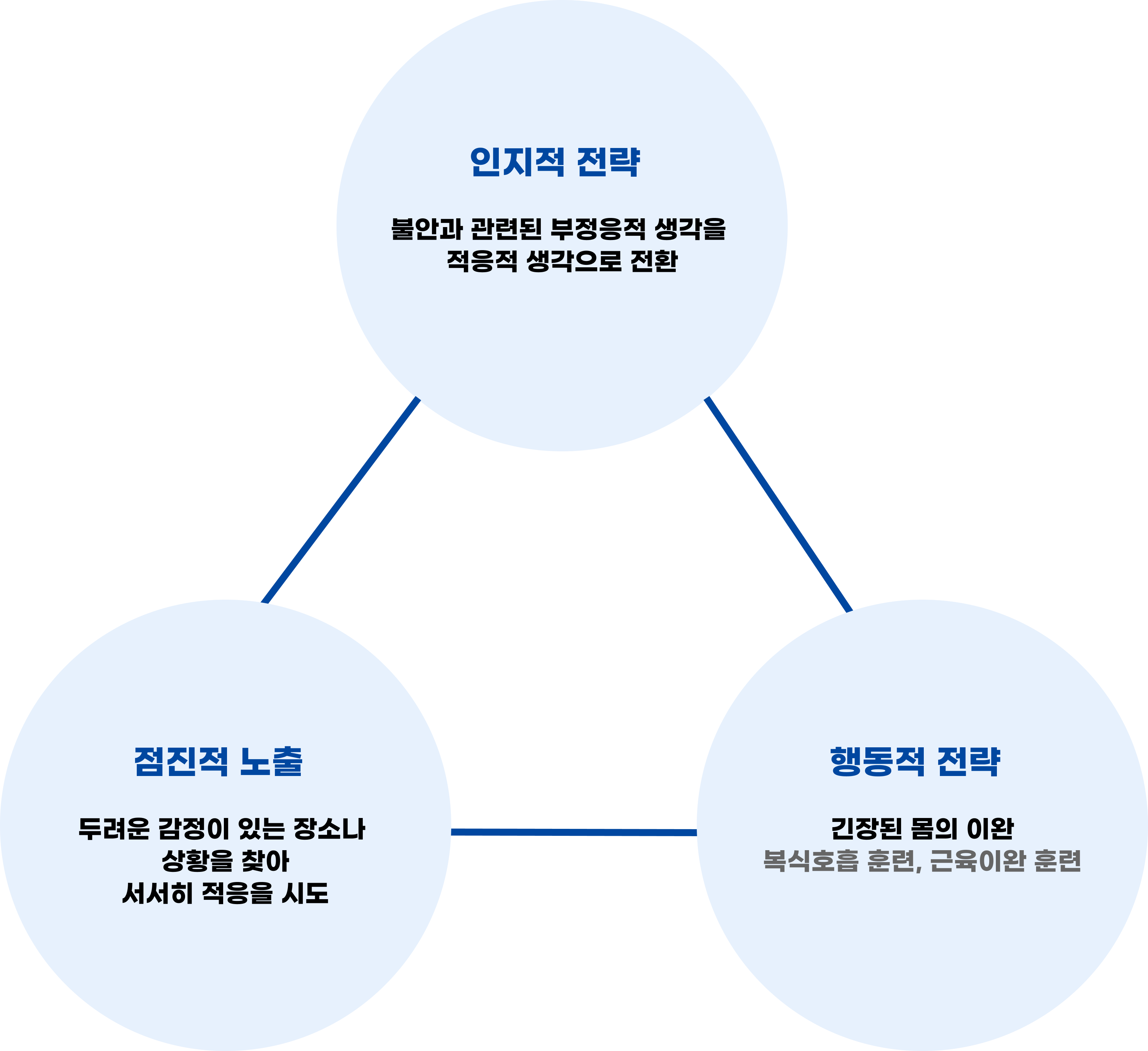 부정적인 자극이나 스트레스가 발생하면 그것에 대해 극단적으로 최악으로 해석하는 경향이 있는데, 이것을 적응적인 전략들로 바꿀 수 있도록 해야 한다. 이 상황은 위급한 상황이 아니라고 생각하는 것이다. 이렇게 인지적으로 생각하면서 긴장된 몸을 이완하는 행동을 취하면 된다. 복식호흡, 근육이완 훈련 등이 대표적이다. 이를 훈련을 하면서 두려운 감정이 있는 장소나 상황을 찾아가는 등 서서히 적응을 하는 것이 필요하다.